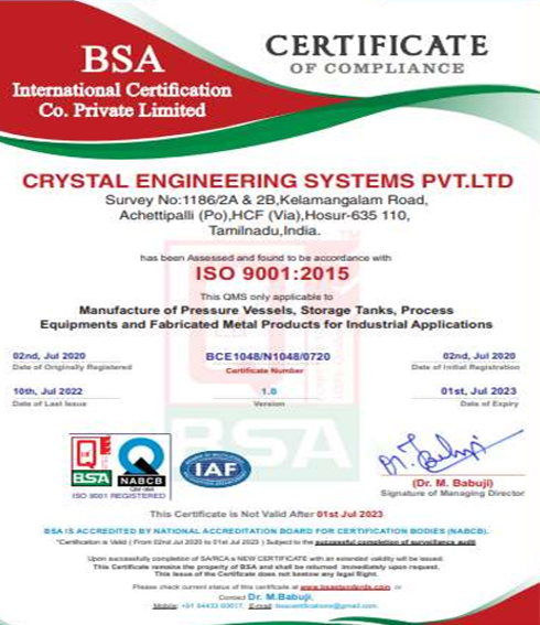 Established in 2000, Crystal Engineering Systems is a trusted name in the manufacturing of pressure vessels, storage tanks, process equipment, SS RO/blending skids, FRP driver desks, and heavy custom-built systems. We serve a broad spectrum of industries with tailored engineering solutions — always honoring commitments and exceeding expectations. Every product is custom-designed to meet specific client needs, with a strong focus on quality, precision, and timely delivery