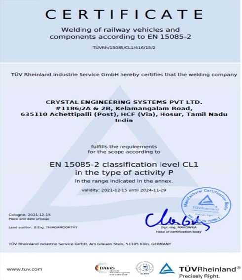 We are certified under EN 15085-2, Classification Level CL1 for welding of railway vehicles and components.